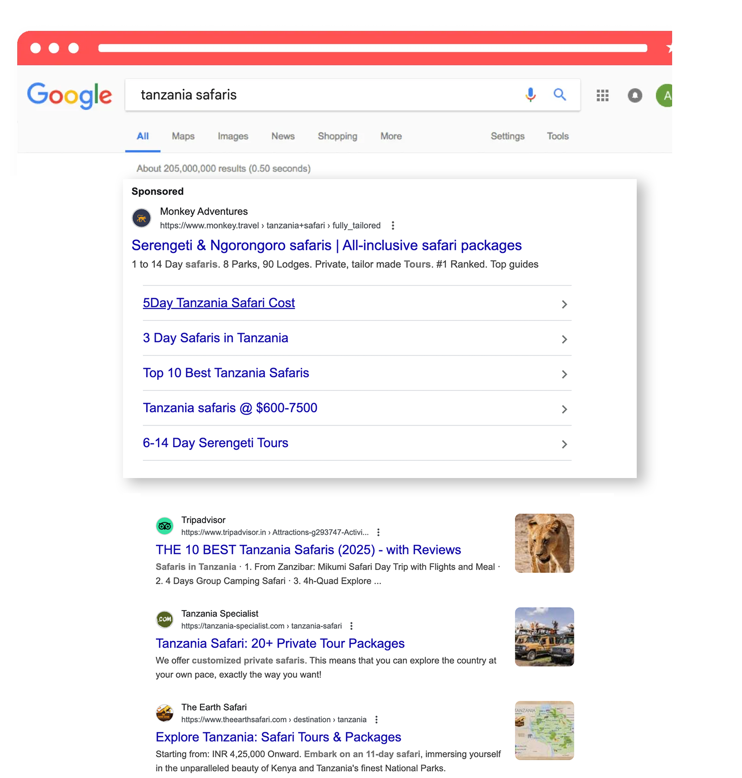 Our experience in safari marketing is unmatched. We don’t see Google Ads as just an ad platform—we see it as a revenue machine that can launch your business to the next level.